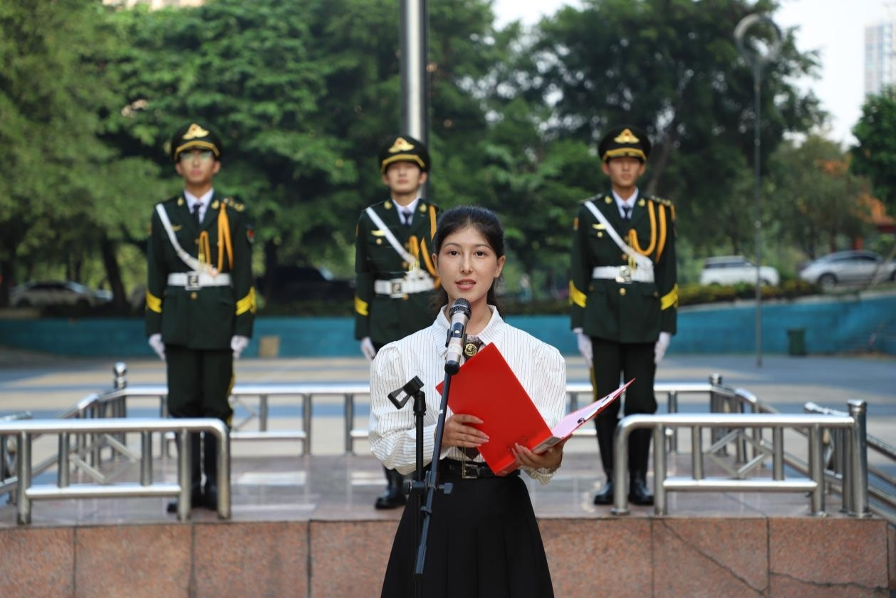 学生代表2024级汉语言文学师范1班的苏热耶·玉荪同学进行国旗下演讲。她用自己的亲身经历和感悟,阐述作为新生的责任与使命,引用习近平总书记对民大学子的期盼和嘱托——“志存高远、敏于求学、学有所成、锻炼成才”,透露出对未来之路的坚定与自信,并表示自己会接稳前辈的接力棒,在相思湖畔书写新一代文院学子的辉煌篇章。