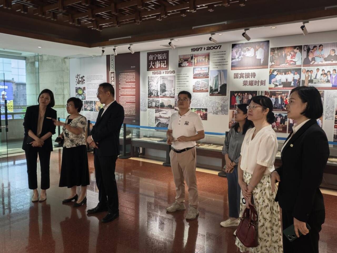 首先,调研组一行在罗庆、党爱芳等人陪同下,参观了南宁饭店历史沿革和品牌展、民族酒楼、小嘟来烘焙店、聚和楼多功能会议厅等,根据罗总经理介绍,南宁饭店原址为南宁府孔庙,具有深厚的历史底蕴,集团目前的产品经营均围绕广西民族风情特色品牌打造,拥有“中国餐饮业百强企业”等多项美誉。