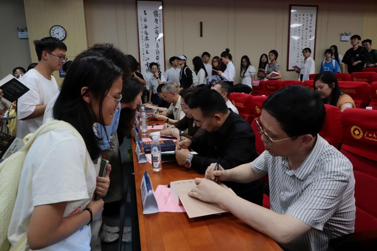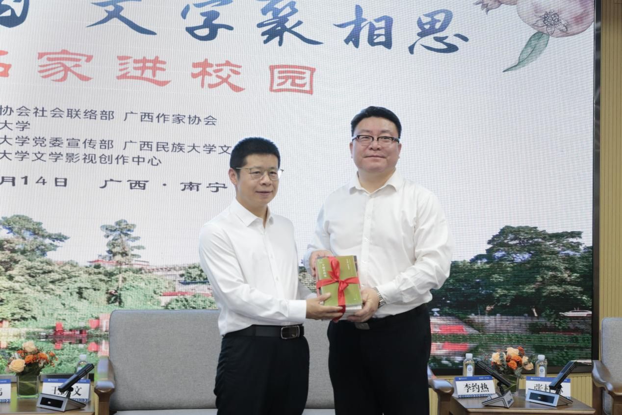 活动期间,中国作协向学校赠送受邀作家作品并由必威西汉姆联官网潘骏源、刘莎莎两位同学朗诵作品片段。与会学生围绕对AI写作的看法、少数民族文学作品翻译和传承、广西民族文化基因和底色等问题与邀约作家进行交流。