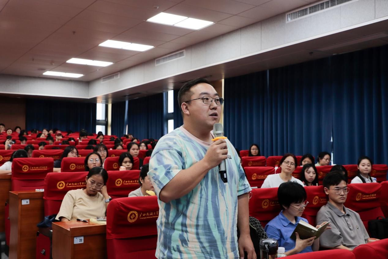 交流互动环节,与会作家就文学创作、文学阅读等方面地细节进行分享。他们鼓励大家进行文学阅读,向在场师生推荐《西游记》《星空与半棵树》《中国历代政治得失》等优秀作品。全国少数民族文学骏马奖优秀翻译奖、作品奖获得者叶尔克西·胡尔曼别克说:“从感受角度出发,懂道理和学习都需要花一辈子的时间。从意义上讲,要把地域和文化本身的趋势作为载体,将其运用好、表达好、发掘好、转化好。”八一电影制片厂原厂长、电视剧《突出重围》的作者柳建伟通过分享自己人生的关键几步,鼓励同学们把握好在广西民大相思湖作家群浸泡的良机。中国作协主席团委员王跃文追溯自己文学创作的脉络,与在场嘉宾进行对话。广西作家协会副主席、《广西文学》主编李约热讲述自己的走上文学创作的经历,认为每一个阶段都是递进式的,需要明确写作的用力点。广西民族大学教授、评论家张柱林老师简要介绍相思湖文学现象,期望出现更多优秀作家,创作出更多优秀作品。