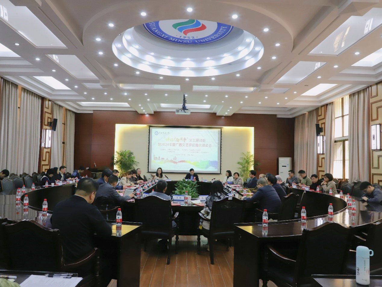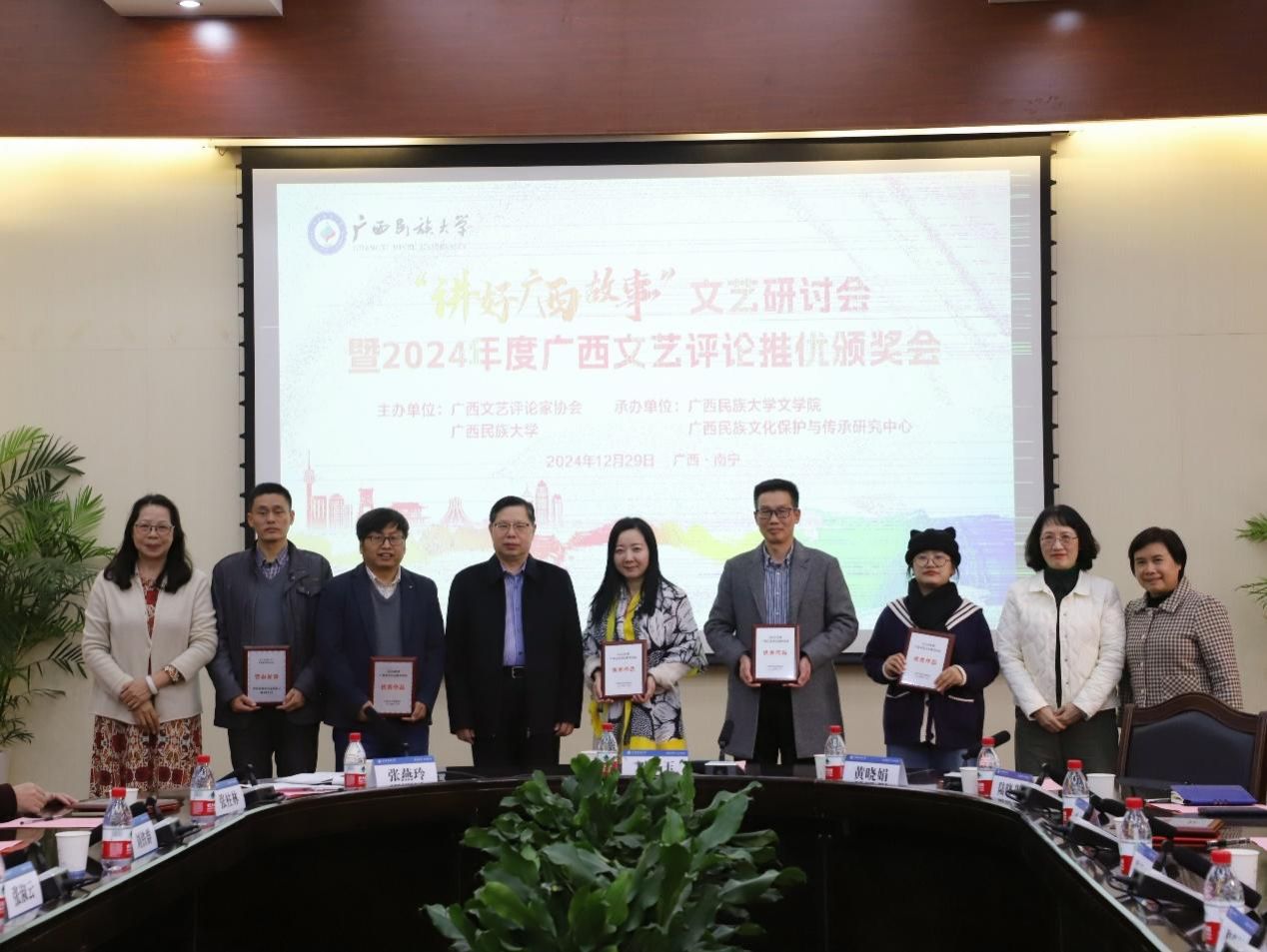 12月29日,“讲好广西故事”文艺研讨会暨2024年度广西文艺评论推优颁奖会在国际交流与合作处会议室举办。自治区文联一级巡视员、副主席刘水玉,广西文艺评论家协会主席张燕玲,广西民族大学副校长黄晓娟,广西民族大学必威西汉姆联官网党委书记陆晓芹,广西文艺评论家协会副主席、《南方文坛》副主编曾攀等文艺界专家学者出席本次会议,必威西汉姆联官网的部分师生代表与会。颁奖会、研讨会分别由张燕玲、张柱林主持。