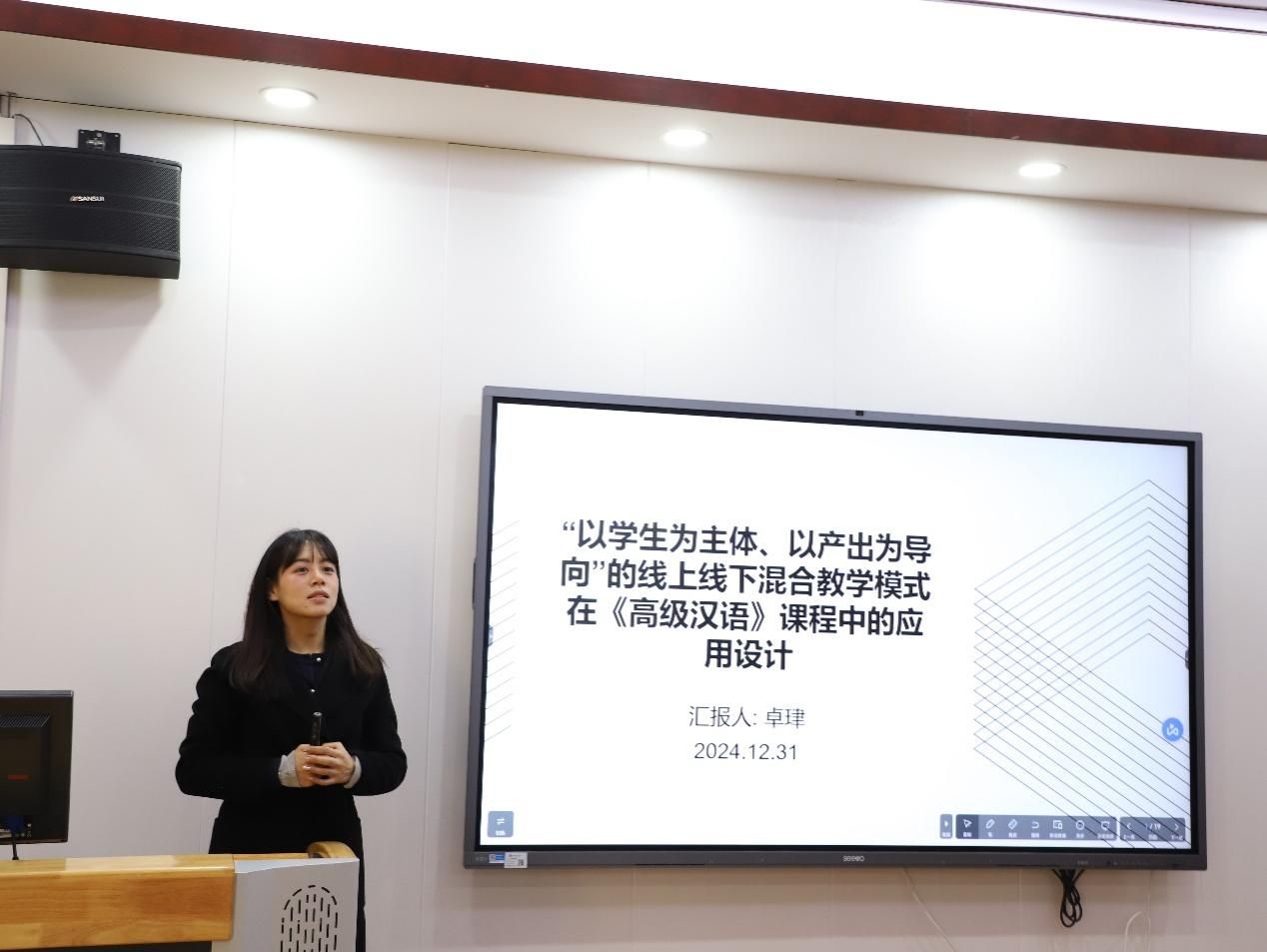 卓珒老师以《“以学生为主体、以产出为导向”的线上线下混合教学模式在<高级汉语>课程中的应用设计》为题进行教学创新汇报。她提到,该课程面向老挝留学生,以线上线下混合模式进行授课。她针对教材滞后、教学模式僵化、实践应用不足等问题,提出创新举措。通过融合线上数字资源与学习平台、多元化评价等方式,解决痛点问题。同时在课前发放阅读材料、开展小组研习、进行课前表达,旨在激活学生知识,提升其语言运用能力。