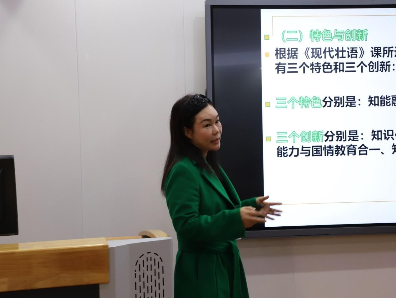 何霜老师从知识技能、过程方法、情感态度价值观等维度出发介绍《现代壮语》课程,将思政元素融入教学内容,通过创新教学方式、开展实践活动等提升学生学习积极性。在教学成果方面,该课程获批广西高校一流本科课程等认定,学生在各类比赛、实践活动中表现积极,教学效果良好,实现了知识传授与思政教育的融合及学生能力的提升。