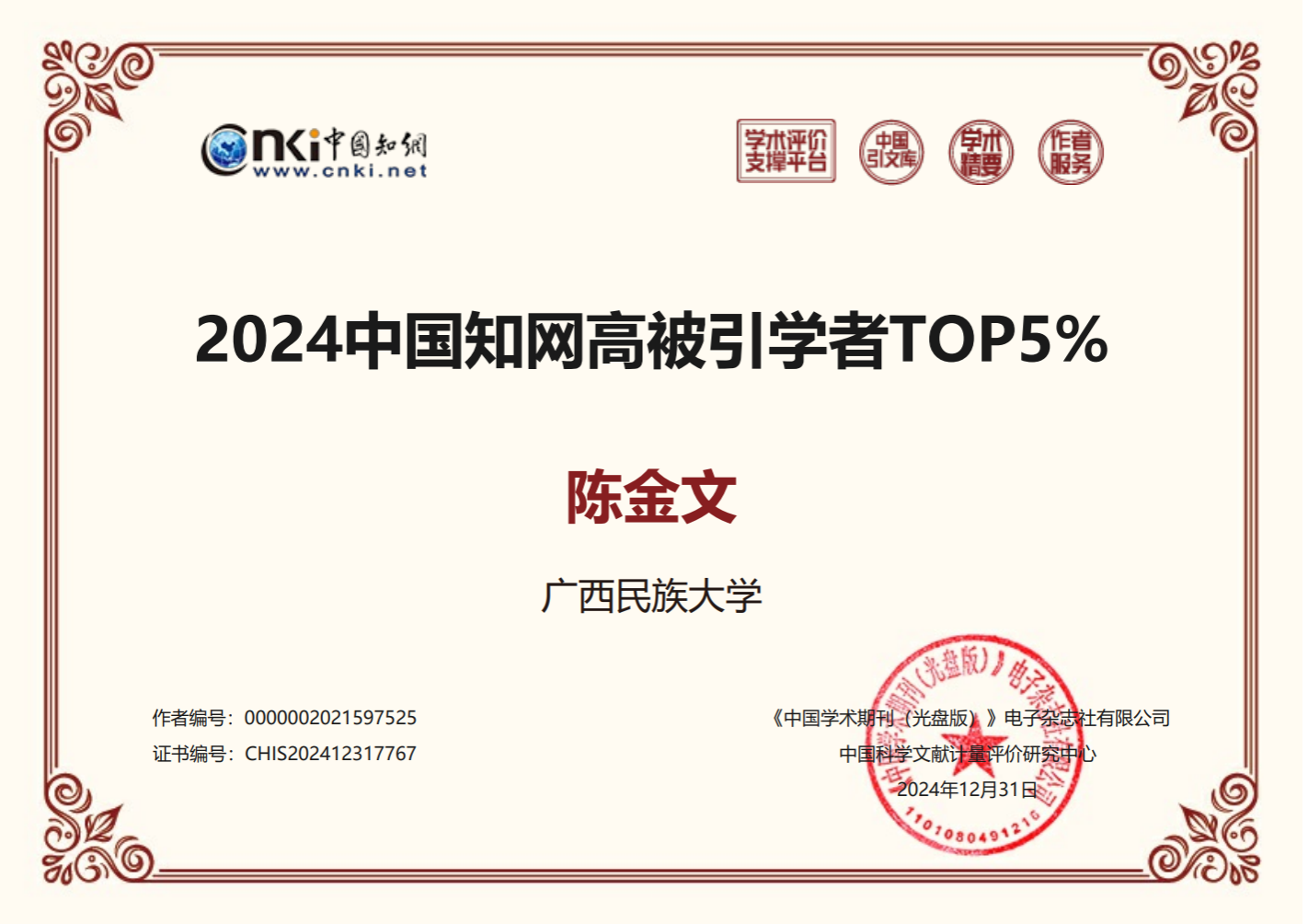 近日,中国知网中国科学文献计量评价研究中心形成“2024中国知网高被引用者”预发布名单,必威西汉姆联官网陈金文老师入选2024年度中国知网高被引用学者TOP5%。我校共39位老师入选,其中文学类入选3人。