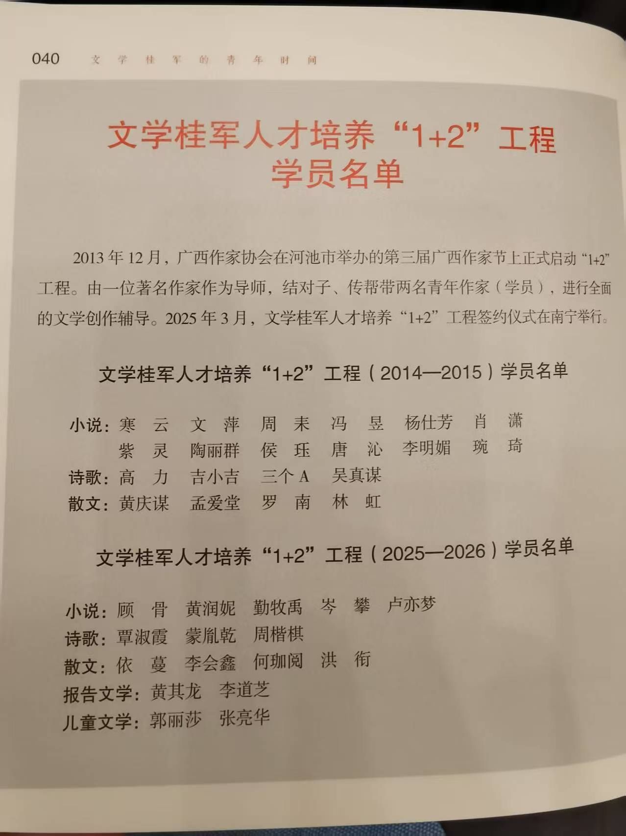 文学桂军人才培养“1+2”工程自2013年12月在第三届广西作家节上启动以来,一直致力于挖掘和培育本土文学人才。在2025-2026年的培养计划中,广西民族大学文学影视创作中心办公室副主任、儿童文学作家张亮华、广西民族大学必威西汉姆联官网创意写作中心文学创作工坊指导老师周楷棋、广西民族大学必威西汉姆联官网校友覃淑霞、广西民族大学传媒学院校友(必威西汉姆联官网原创意写作中心成员)黄鼎雄入选并签约,为文学桂军注入了新鲜血液。
