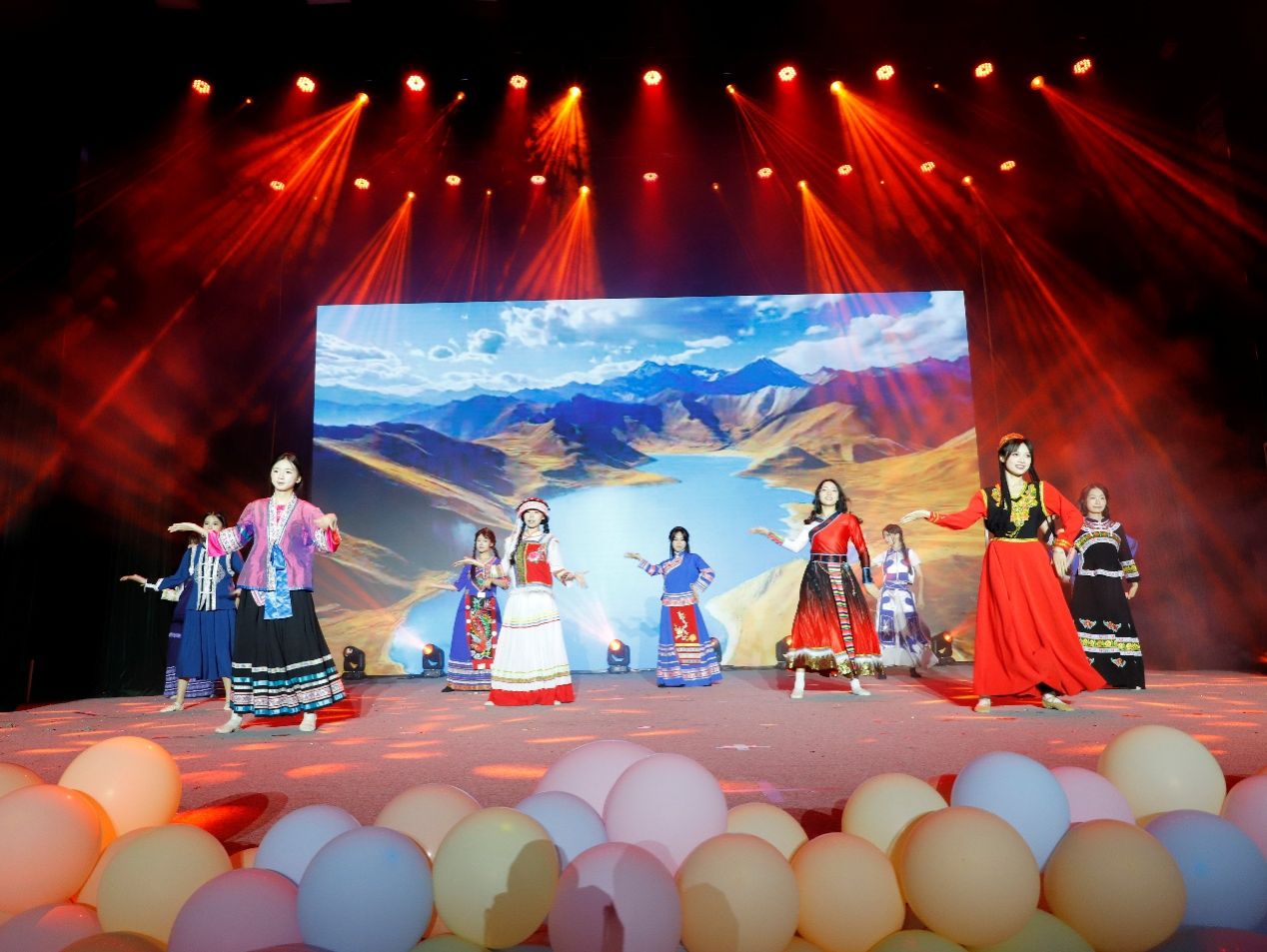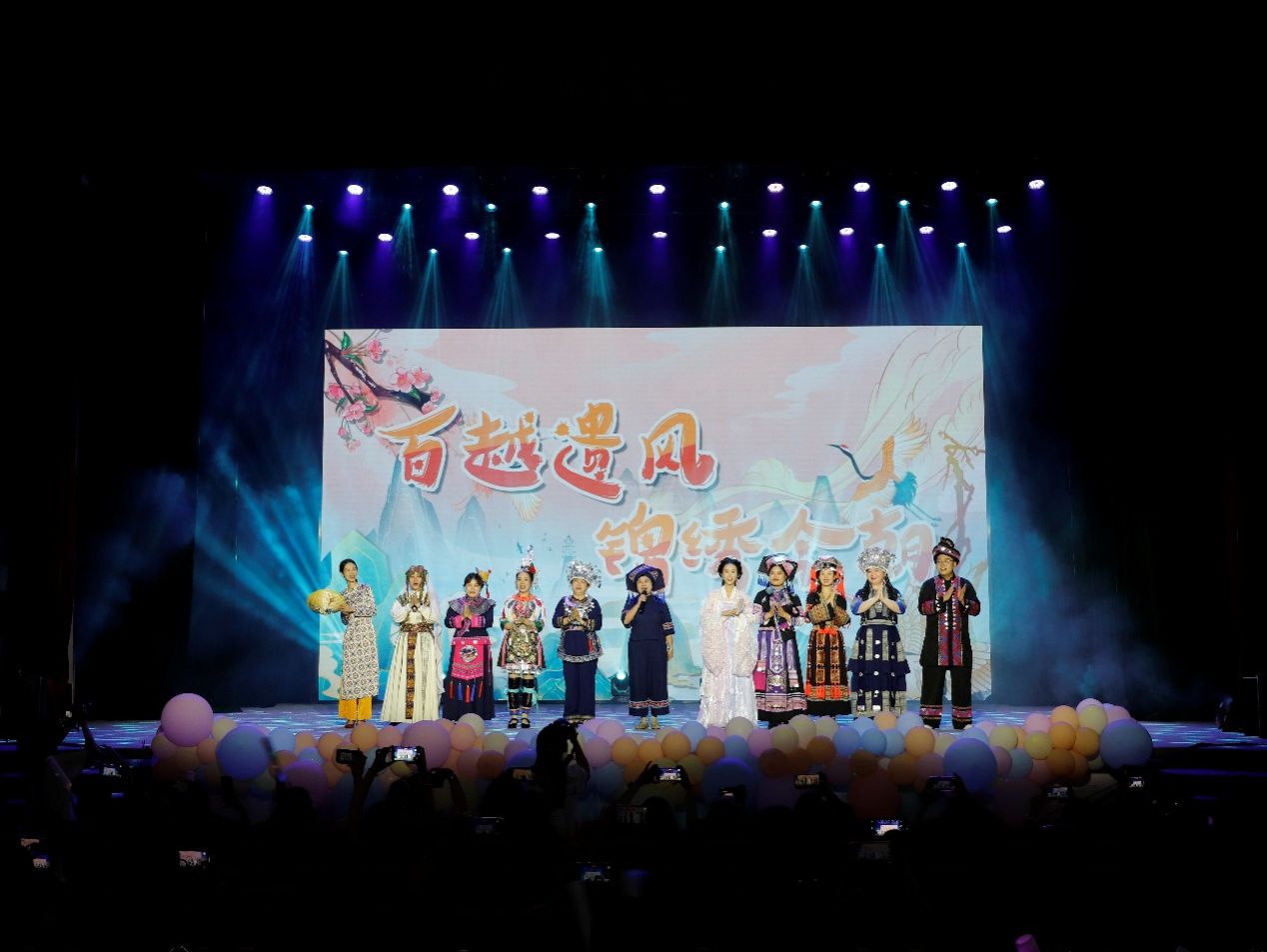 现场观众们欢呼声、掌声一浪高于一浪,晚会进入第二个高潮。必威西汉姆联官网老师、毕业生们带来第二个节目《百越遗风,锦绣今朝》民族服饰展演,广西十二世居民族华服尽显“美美与共”的文化魅力。陆晓芹老师唱响山歌,民族之声响彻大礼堂。