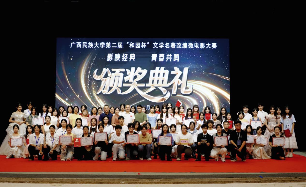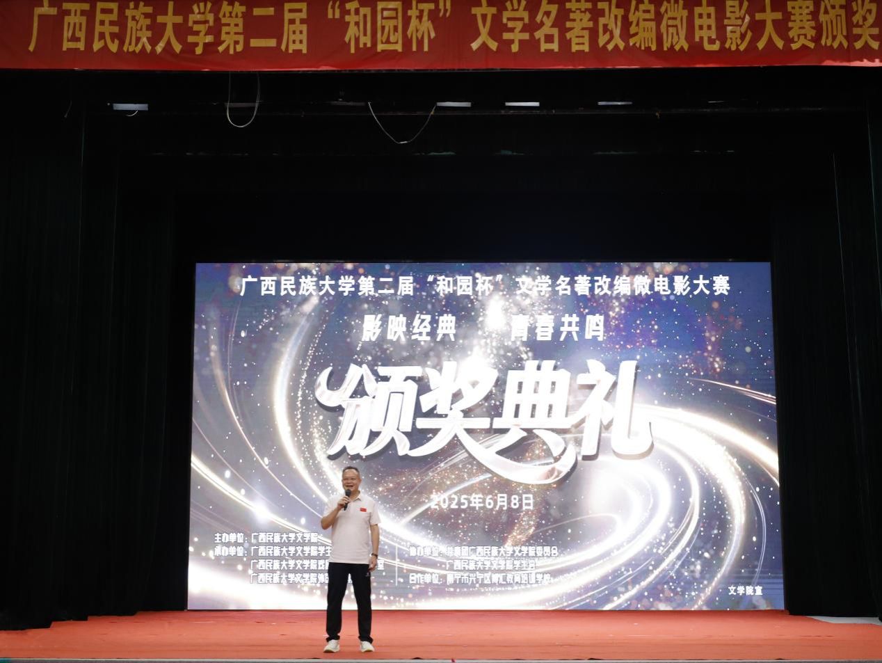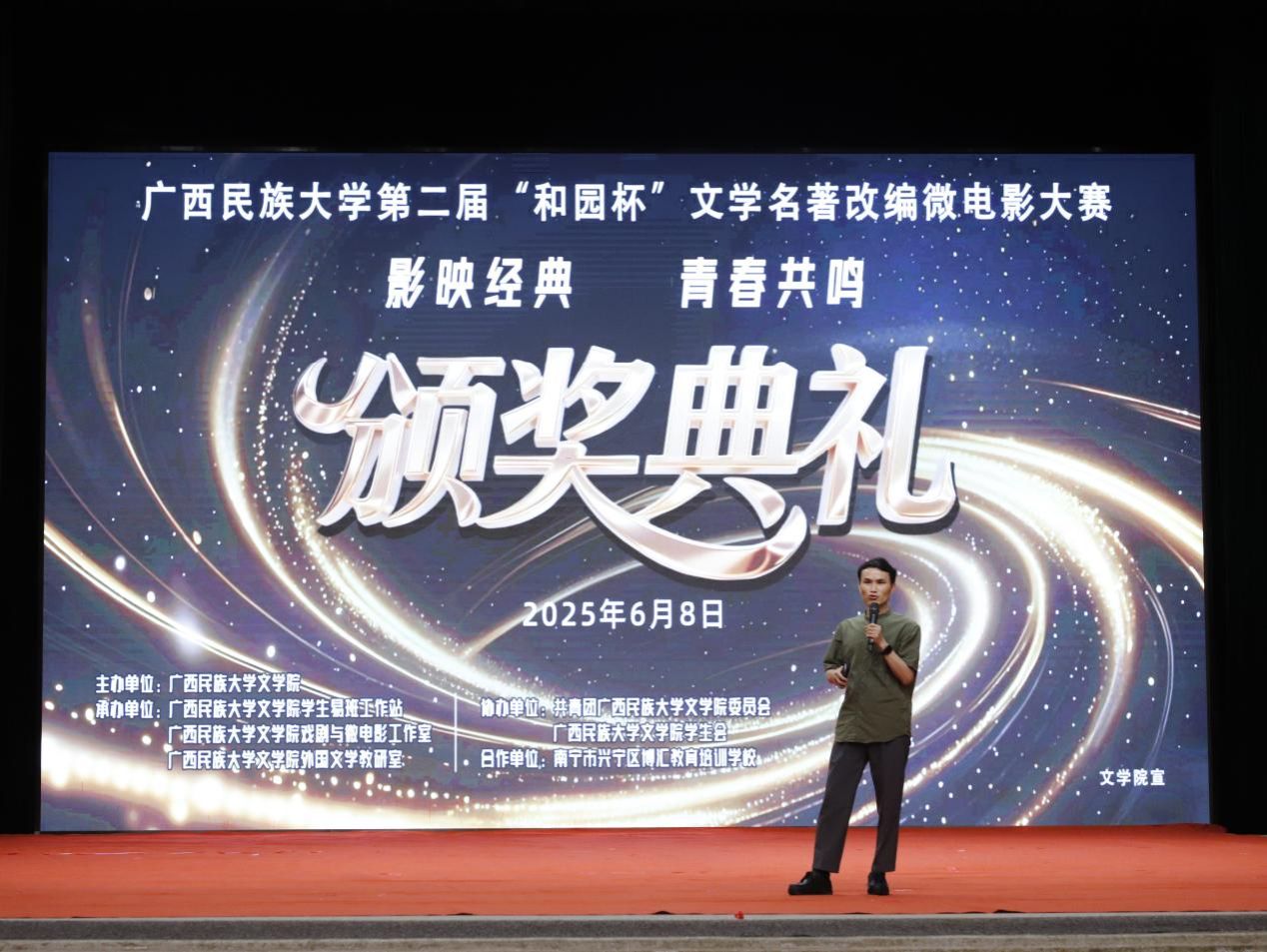 6月8日晚,广西民族大学第二届“和园杯”文学名著改编微电影大赛颁奖典礼在相思湖校区大礼堂举行。必威西汉姆联官网党委副书记吴先源,传媒学院副院长万益杰,必威西汉姆联官网汉语言文学系主任李惠玲,必威西汉姆联官网外国文学教研室李忠敏、蔡勇庆、唐子尊,广西千年传说影视传媒股份有限公司编剧韦晗依,南宁市兴宁区博汇教育培训机构副校长周欣等嘉宾出席典礼并为获奖者颁奖。