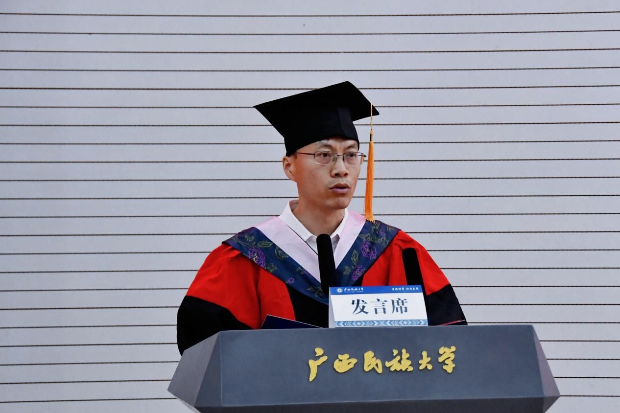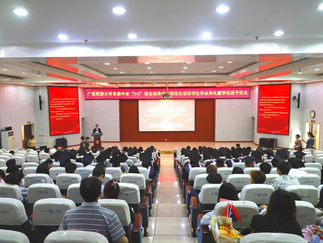 一穗一拨,一书一授,一礼一成,一生一忆。6月21日上午,广西民族大学首届中老“2+2”联合培养中文师范生项目学生毕业典礼暨学位授予仪式在科技楼报告厅举行。教育部中外语言交流合作中心副主任胡志平、老挝驻南宁领事馆总领事翁巴努·西巴色、广西壮族自治区教育厅对外交流合作处处长罗耀光、老挝国立大学校长德萨努拉·森登德、广西民族大学党委书记卞成林、广西民族大学校长韦仕珍出席活动。仪式由广西民族大学副校长高兴宇主持。