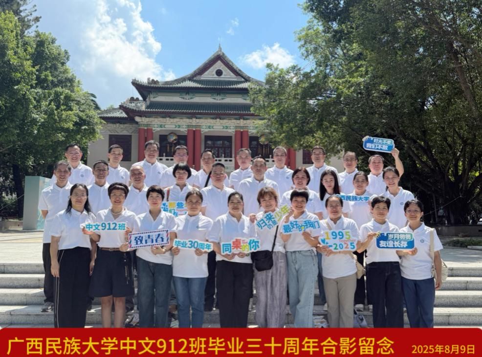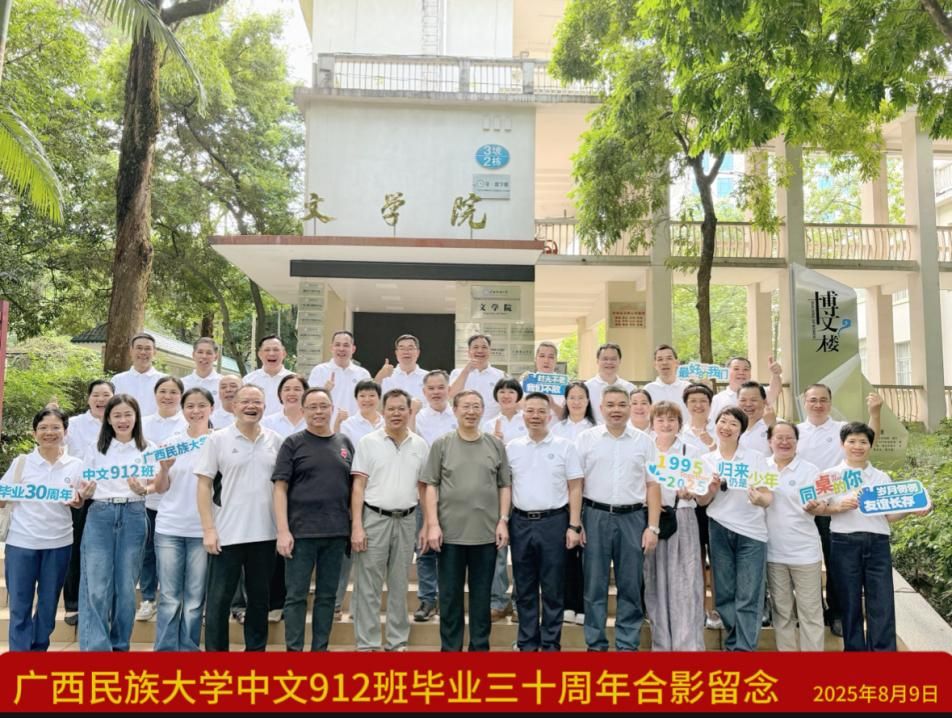 盛夏情谊浓,重逢正当时。2025年8月9日,广西民族大学必威西汉姆联官网1991级912班校友四海归航,齐聚相思湖畔,举行“卅载再聚,感恩同行”毕业30周年返校活动。广西民族大学原党委书记卞成林,学校党委副书记陈铭彬,必威西汉姆联官网党委书记陆晓芹、党委副书记吴先源以及教师代表甘品元、郭金世等领导老师与30名校友共叙师生情谊。