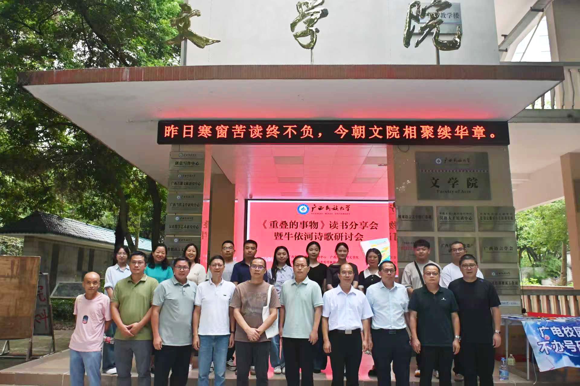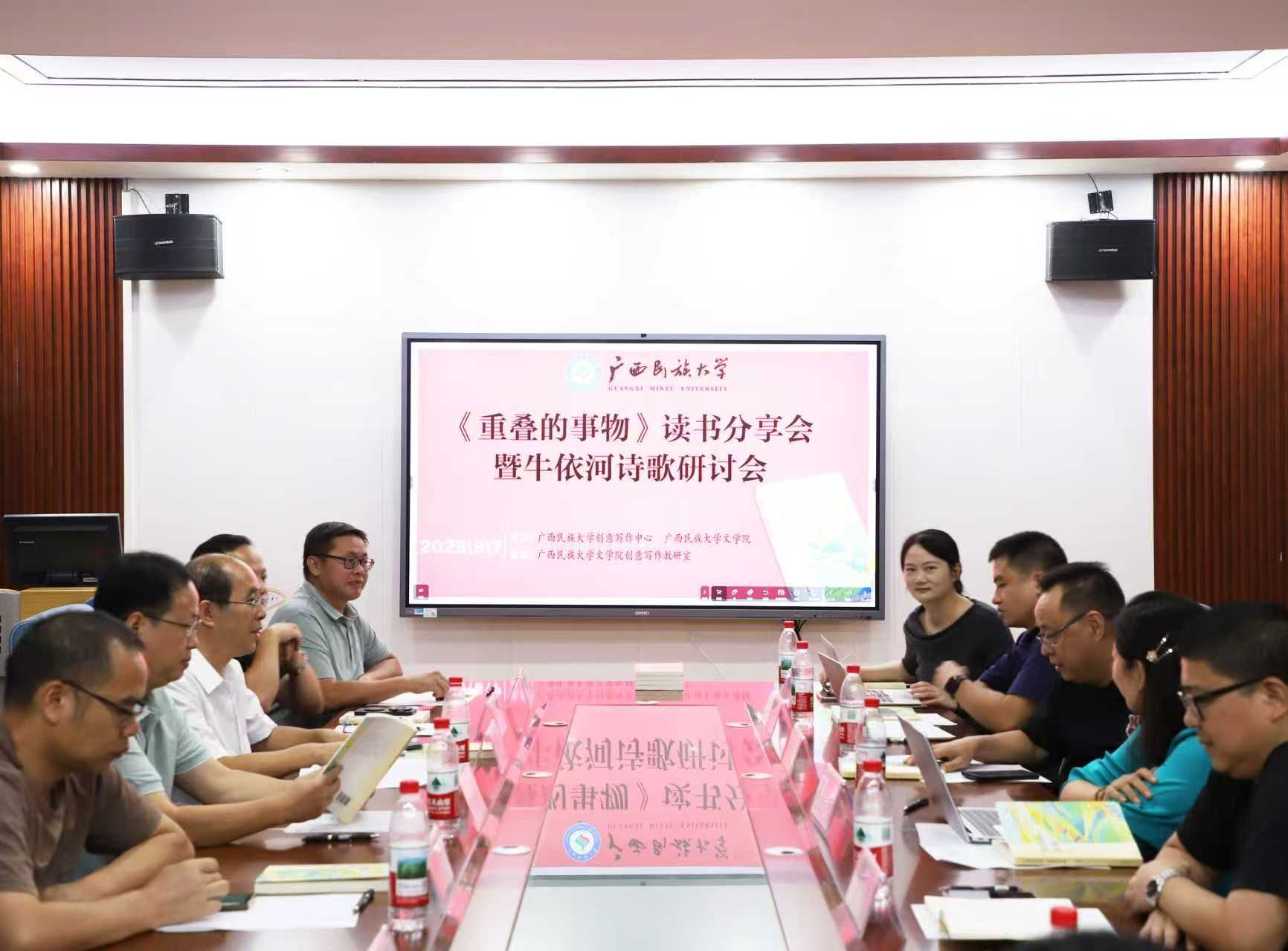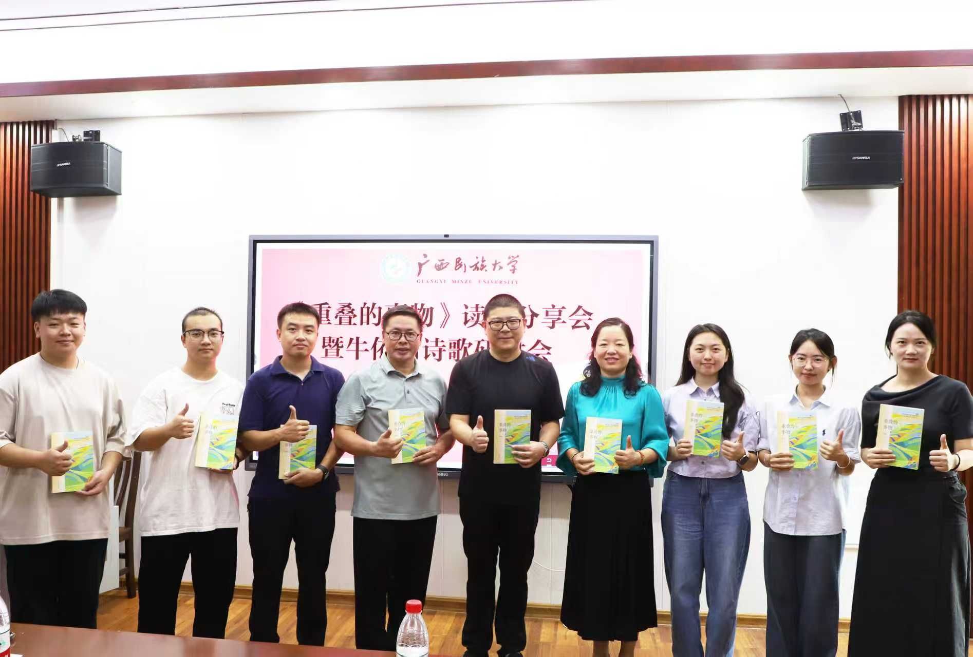 9月7日,《重叠的事物》读书分享会暨牛依河诗歌研讨会在广西民族大学必威西汉姆联官网举行。广西作家协会副主席刘春、广西文艺评论家协会副主席丘文桥、广西作家协会秘书长杨合、自治区社科联科普部主任杨辉、南宁职业技术学院党委组织部(统战部、人事处)副部长李云华、南宁师范大学研究员钟世华、必威西汉姆联官网党委书记陆晓芹及创意写作中心教师及学生代表出席本次会议。会议由我院杨逸云老师主持。