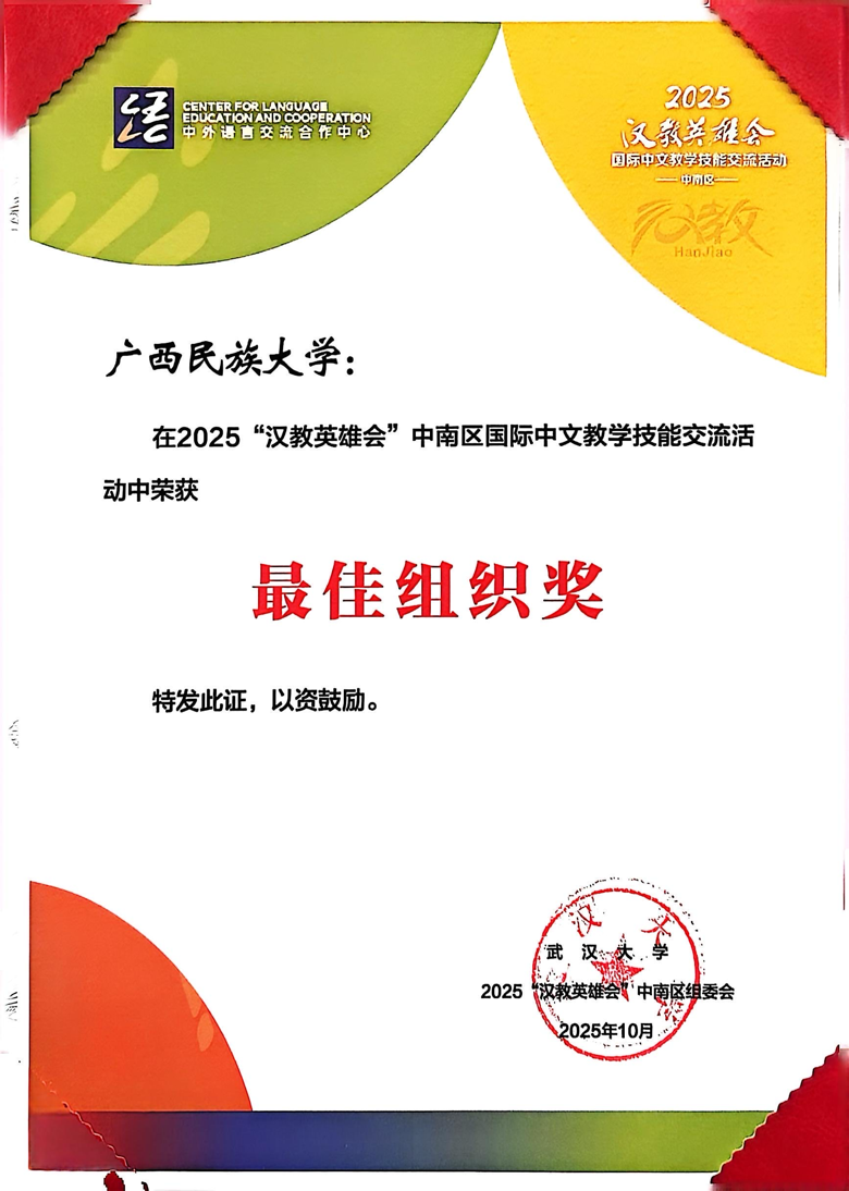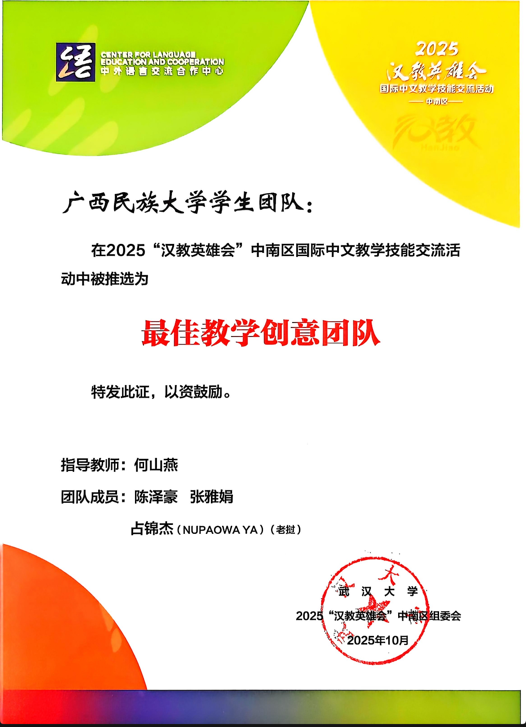 10月25日,由教育部中外语言交流合作中心、全国国际中文教育专业学位研究生教育指导委员会和全国高校汉语国际教育本科专业负责人联席会联合主办、武汉大学承办的2025年“汉教英雄会”中南片区国际中文教学技能交流活动在武汉成功举办。我院国际中文教育硕士生团队凭借卓越表现,在激烈竞争中脱颖而出,荣获“最佳教学创意团队”和“最佳组织”两项大奖。