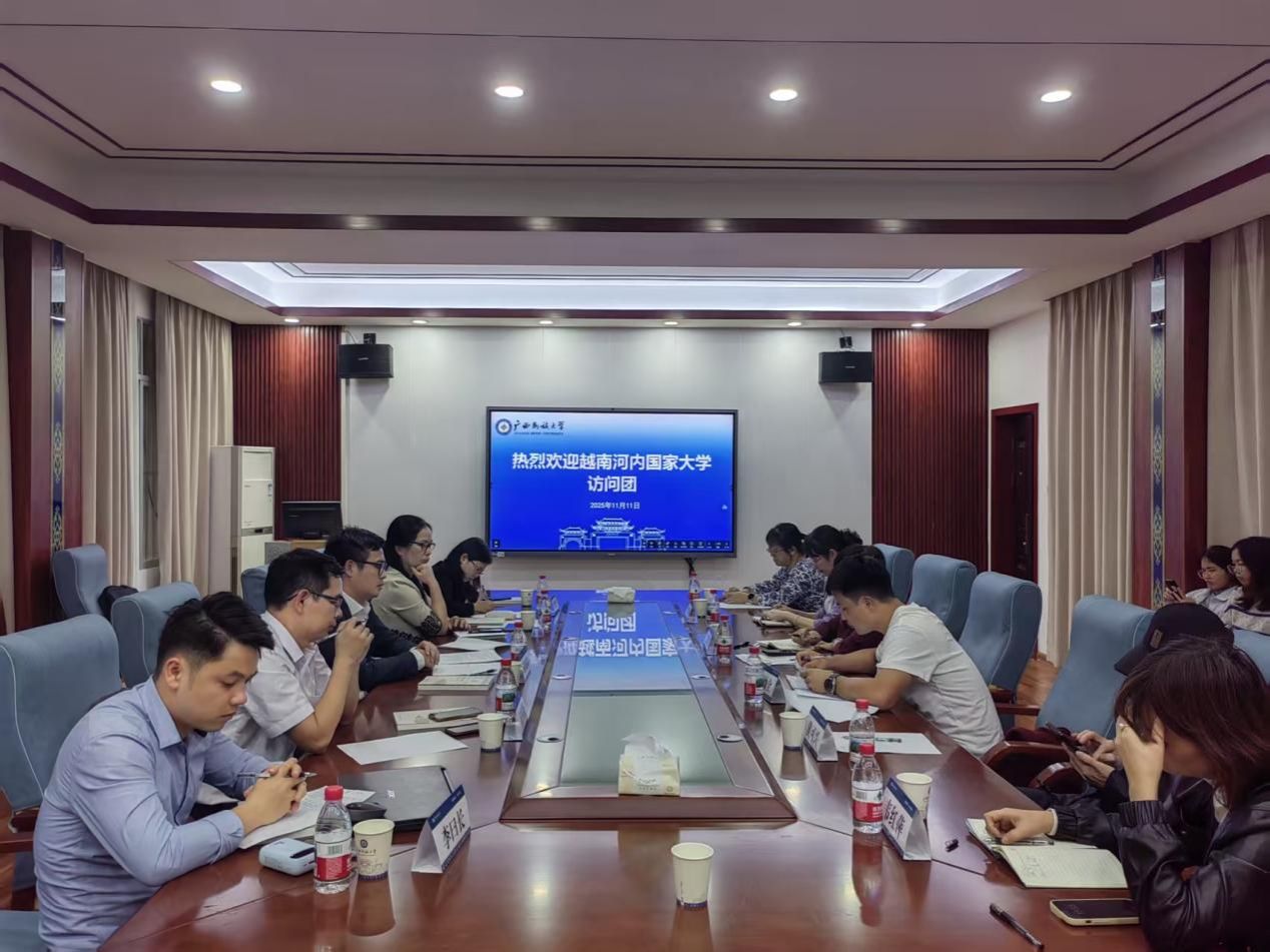 11月11日下午,中越语言文化研究合作交流研讨会在博文楼204会议室成功召开。本次研讨会由必威西汉姆联官网主办,越南河内国家大学越南学与发展科学研究所所长范德英、主任冯氏清琳、副主任黎翠姮、副主任阮怀秋及教师李曰长等一行五人应邀参会,陆晓芹院长、何山燕副院长及李惠玲、黄可兴等教师代表共同出席研讨会。