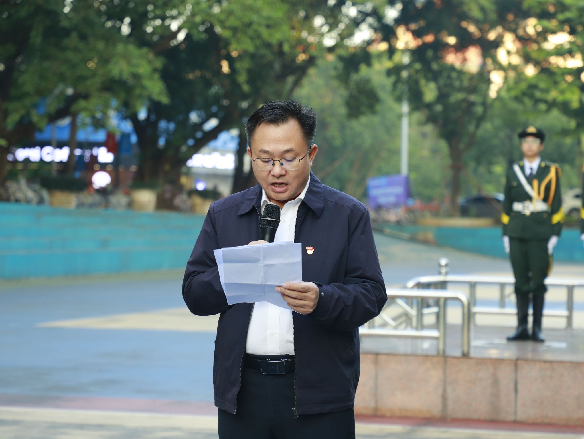 学院党委书记唐艳军发表国旗下讲话。他回顾本学期学院在教书育人、科学研究与文化传承等领域取得的显著成绩,展望未来发展宏图。唐艳军书记表示,面向“十五五”发展新阶段,学院将重点推进学科内涵建设、教育教学改革、国际交流合作等工作。为深入贯彻落实党的二十大和二十届四中全会精神,他向全院师生提出三点希望:一要坚定理想信念,筑牢思想根基;二要勇于创新创造,提升能力本领;三要坚持追求卓越,矢志艰苦奋斗,号召全体师生凝心聚力,为建设国内一流学院、繁荣发展社会主义文化贡献力量。