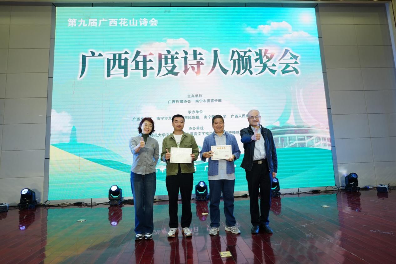 第九届花山诗会邀约全国诗歌名家大家与本土诗人汇聚一堂,构建高水平交流平台,共话诗意八桂。24日下午,“登高望远·八桂新篇”主题诗歌朗诵会暨广西年度诗人颁奖会在南宁师范大学五合校区举行。湖南锈才获评第九届花山诗会“年度诗人”,周楷棋获评第九届花山诗会“年度新锐诗人”。