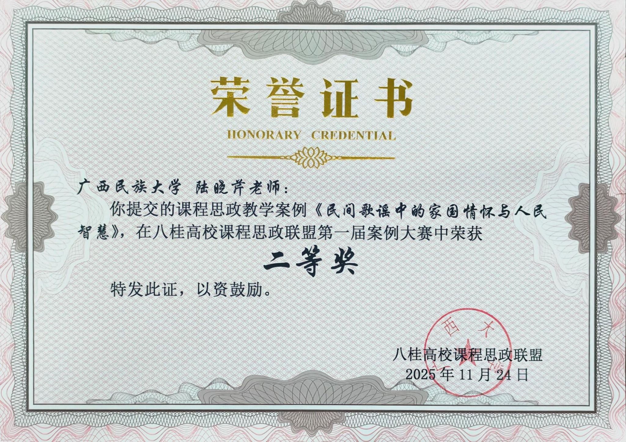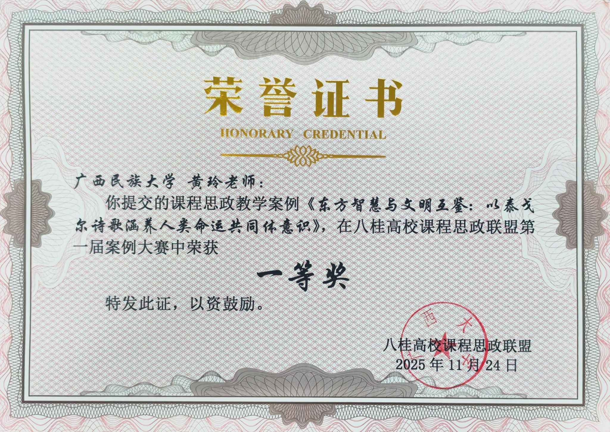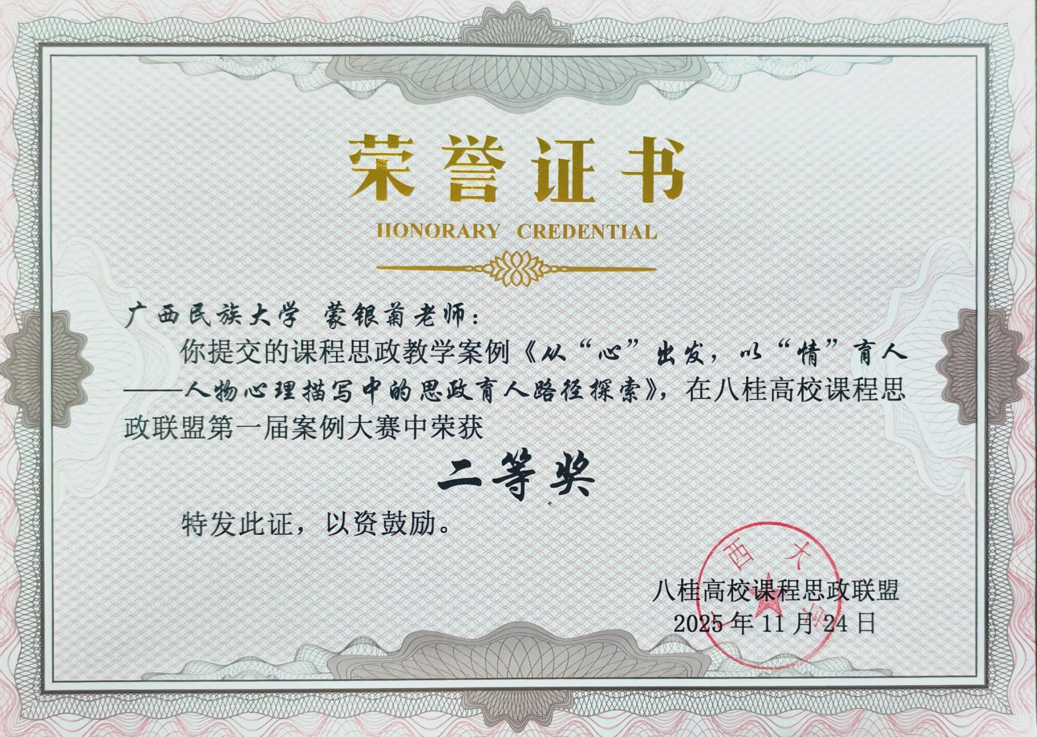 杨荔斌老师所撰写的案例《基于自主性交互式文学功能知识教学的“以文化人”育才实践》获特等奖,黄玲老师所撰写的案例《东方智慧与文明互鉴:以泰戈尔诗歌涵养人类命运共同体意识》获一等奖,陆晓芹老师撰写的《民间歌谣中的家国情怀与人民智慧》和蒙银菊老师撰写的《从“心”出发,以“情”育人——人物心理描写中的思政育人路径探索》获二等奖。我院参赛教师团队立足教学实际,紧跟学术前沿,精准挖掘思政元素与专业教学的融合点,紧密结合文学教育的内涵与特点,覆盖文学功能知识教学、东方文学经典阐释、民间文学价值挖掘等多个维度,体现思政教育与专业教学的有机融合,以鲜明的育人导向、创新的设计思路和扎实的教学能力获得评审团的认可。