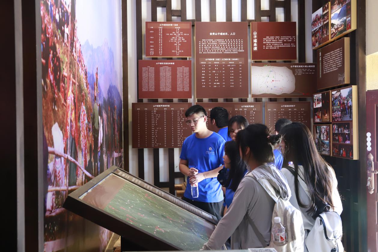 本次实训主要在金秀镇六拉村奋战屯、金秀屯、白沙屯、六拉屯、昔地屯,长垌乡平道村古占屯开展调研,内容包括瑶语实践、文化调查、瑶文教学与宣传,以及观摩体验等,涵盖盘瑶、山子瑶、茶山瑶三个瑶族支系。语言文化调查是本次实训的重要环节。学生们分成4个小组,每组配有一名研究生助手进行指导。他们依次对奋战屯盘瑶、古占屯山子瑶和金秀屯六拉屯茶山瑶进行调研,练习瑶语,调查词汇、音系,采集民间故事,了解历史文化。