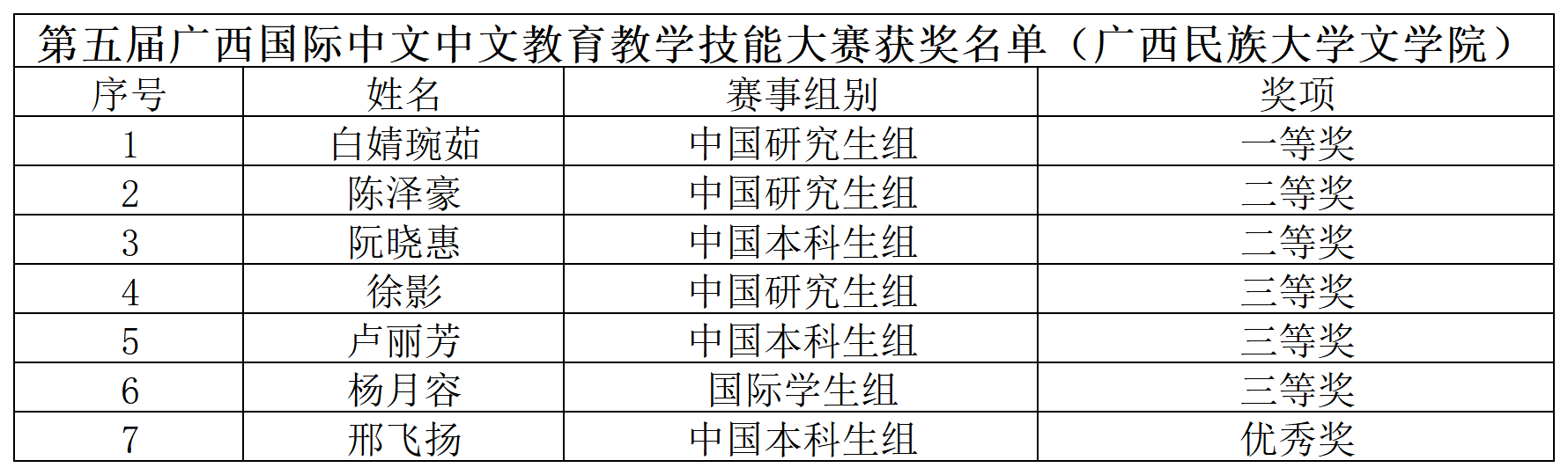 11月16日至17日,第五届广西高校国际中文教育教学技能大赛在桂林举行。必威西汉姆联官网派出7名选手参赛,在比赛中斩获一个一等奖,两个二等奖,三个三等奖,一个优秀奖共七项区级奖项。我院吴术燕老师获优秀指导教师奖。