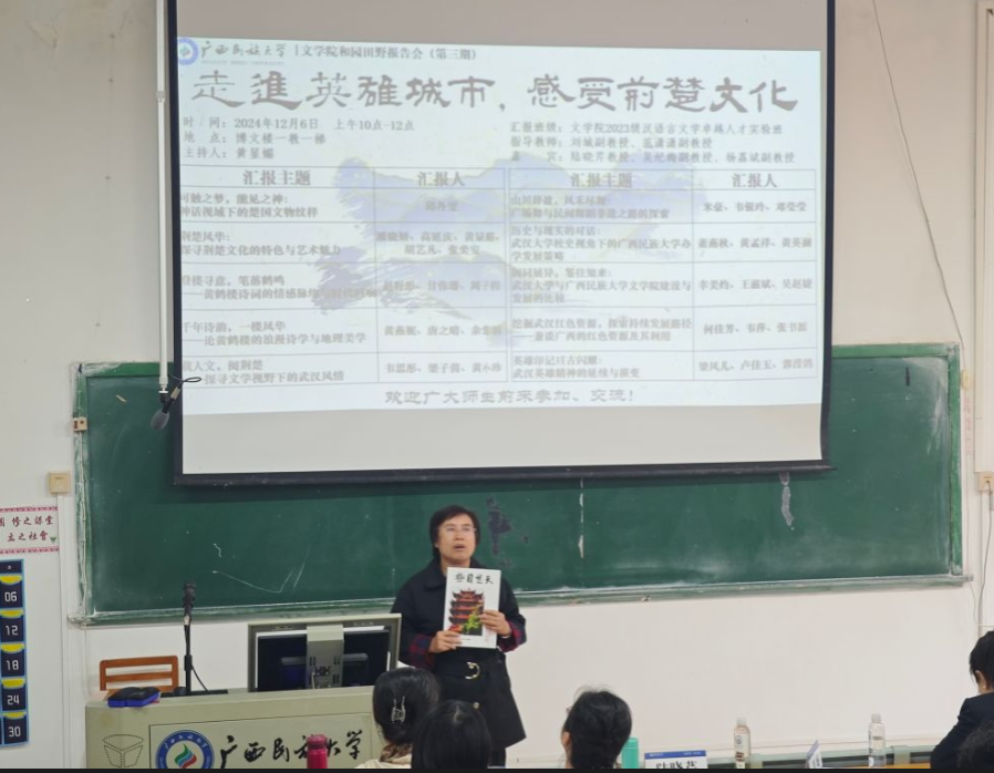 为高效落实汉语言文学卓越人才实验班培养方案,12月6日,2023级汉语言文学卓越人才实验班在博文楼一教二梯举行武汉研学总结汇报会,陆晓芹、范潇潇、吴纪梅、杨荔斌、刘城等领导老师出席本次汇报会,必威西汉姆联官网2022级、2024级汉语言文学卓越人才实验班全体学生到场观摩交流。2023级卓越人才实验班黄显媚同学主持本次会议。