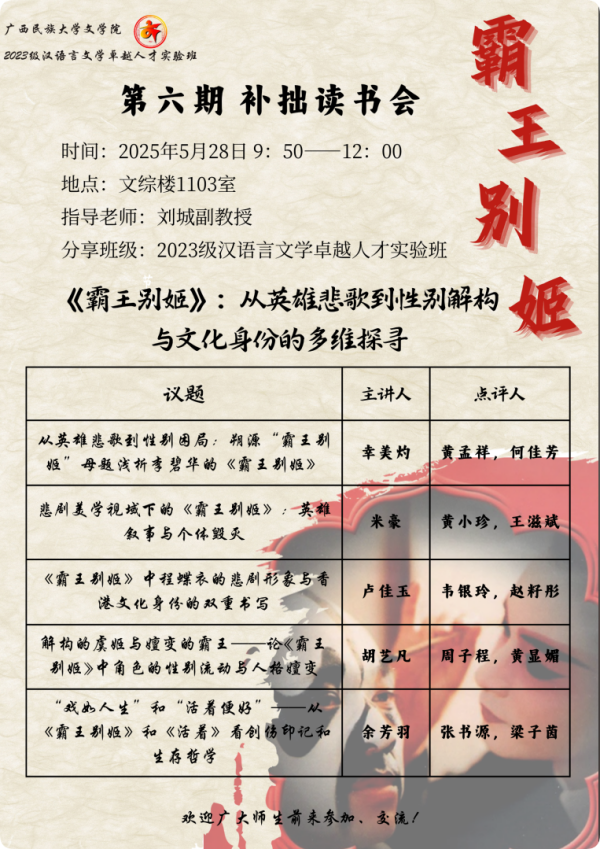 5月28日上午必威西汉姆联官网第六期“补拙读书会”在文综楼1103举行,本次读书会由2023级汉语言文学卓越人才实验班承办,刘城副教授担任指导老师,主题为“《霸王别姬》:从英雄悲歌到性别解构与文化身份的多维探寻”。