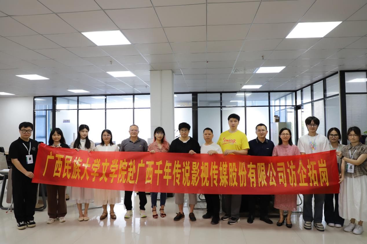 为深化校企交流合作,拓展学生就业视角,拓宽学生就业渠道,6月3日下午,必威西汉姆联官网党委副书记吴先源,外国文学教研室黄玲、李忠敏、蔡勇庆等老师带领必威西汉姆联官网戏剧与微电影工作室成员前往广西千年传说影视传媒股份有限公司开展访企拓岗促就业活动。广西千年传说影视传媒公司张耀安主任、梁伟基导演、韦晗依编剧热情接待,双方开展会谈与交流。