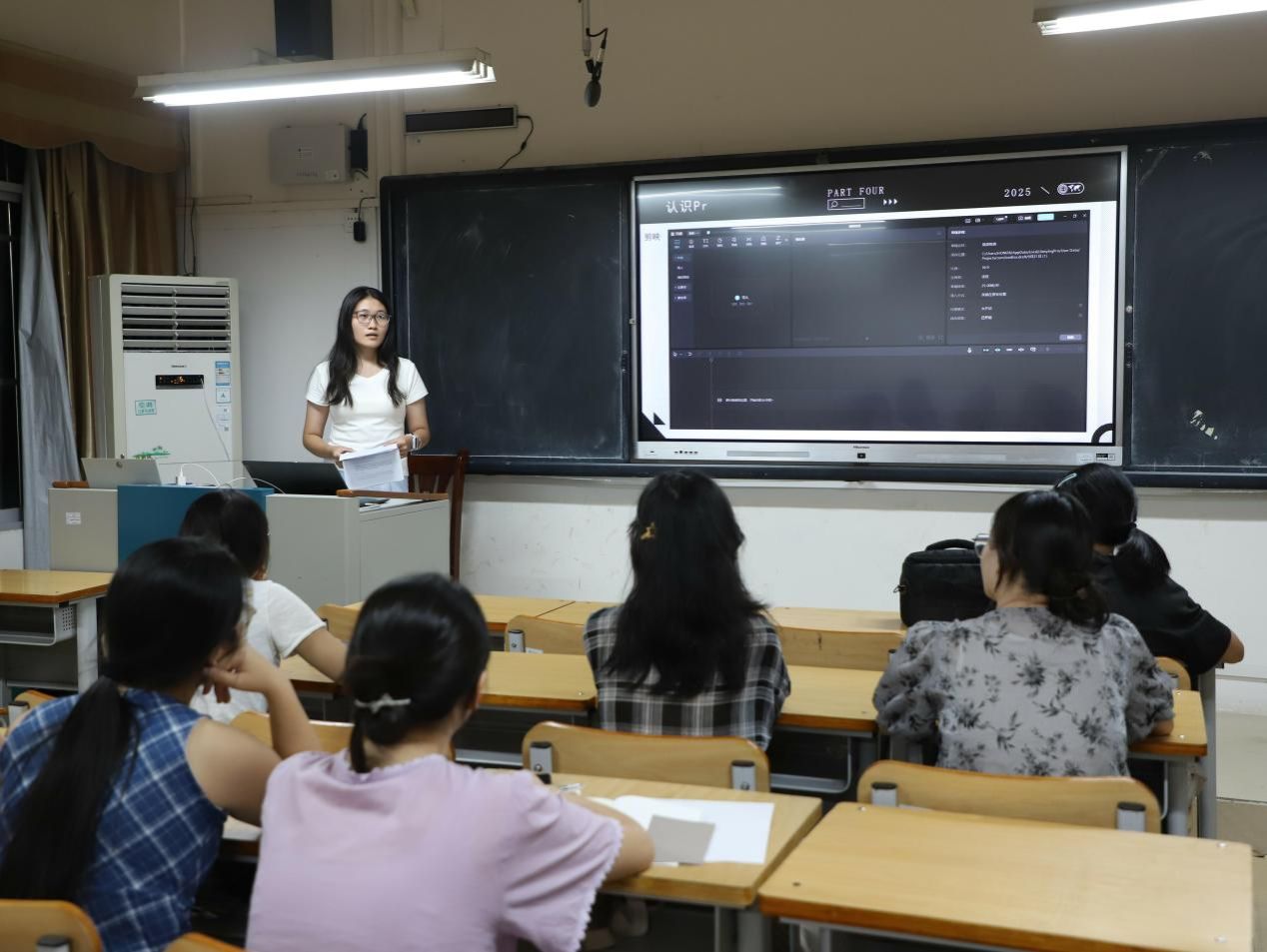 陈思颖同学围绕分镜头脚本设计、素材收集及拍摄规范三大核心内容展开讲解。她详细介绍分镜头脚本的撰写方法,强调拍摄前应做好充分规划,并特别提醒同学们注意全景、中景、近景等多景别搭配,以强化视频的层次感与叙事力。她鼓励同学们将培训所学应用于研学实践,通过系统的前期策划、精细化拍摄与后期剪辑,将研学中的所见所闻、所思所感转化为完整的视频作品。