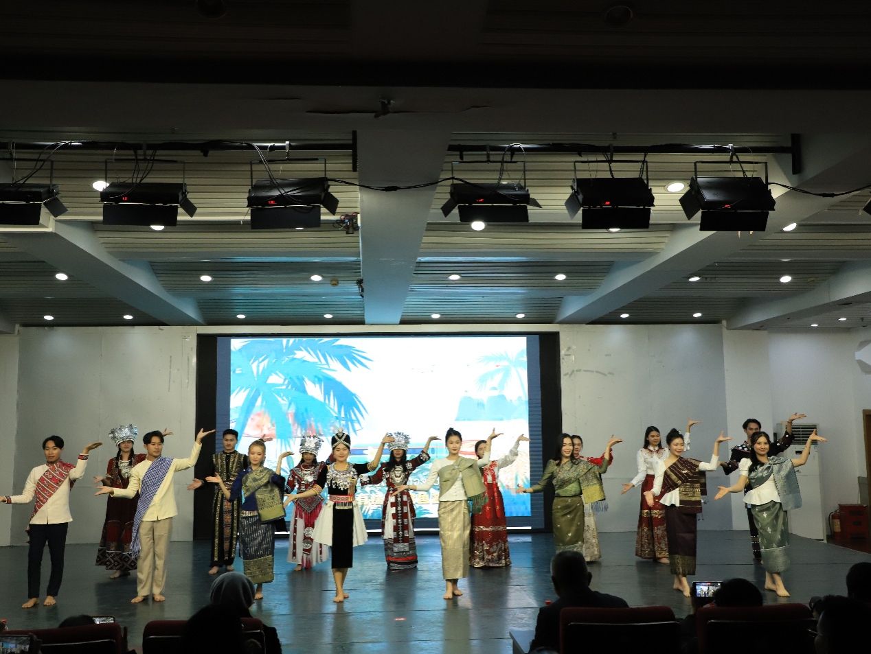 瑶语壮韵,诗承千古。2023级中国少数民族语言瑶语班为观众献唱歌曲《迎客歌》《瑶山好》、吟唱粤语童谣《月光光》,演绎瑶族经典曲目《瑶族嫁郎》,生动呈现瑶族传统习俗与待客文化;2025级、2023级中国少数民族语言壮语班分别朗诵《诗行广西》《我在一颗石榴里看见了我的祖国》,表达对家乡的深情与对民族团结的赞颂;沧岚动漫社舞蹈《听见wo》及文艺部黄诗颖独舞《One Spark》,融合传统韵律与现代节奏,展现出艺术表达的多元融合;2025级中国少数民族语言瑶语班踏歌传唱《瑶家敬酒歌》,2025级汉语国际教育印尼语班于紫馨演唱《天若有情》,呈现出中华民族文化的丰富内涵与时代活力。
