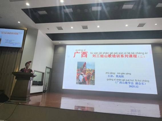活动期间,莫高阳副会长为东盟各国留学生开展生动的歌谣教学。他以“刘三姐歌谣”的历史渊源与地域特色为切入点,深入解读歌谣嘹亮婉转的音色特点与即兴对唱的韵律逻辑,并结合经典选段,带领留学生逐句学唱《山歌好比春江水》,手把手传授基础演唱技巧。留学生们踊跃参与,在一唱一和的山歌互动中,切身体会到“以歌传情、以歌叙事”的独特艺术表达魅力。活动尾声,全体嘉宾与全体师生合影留念,共同留念这场“刘三姐歌谣”传习活动。