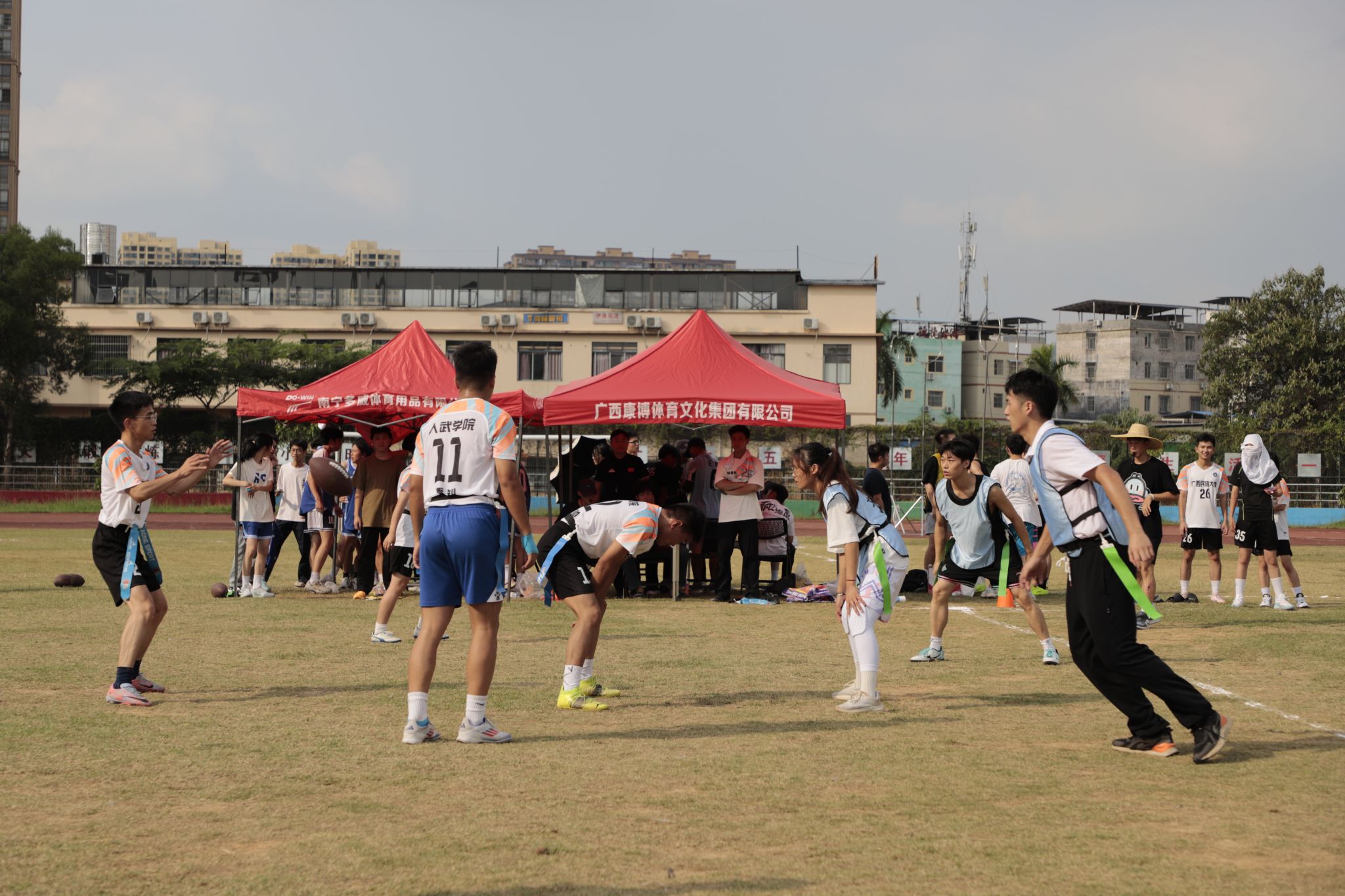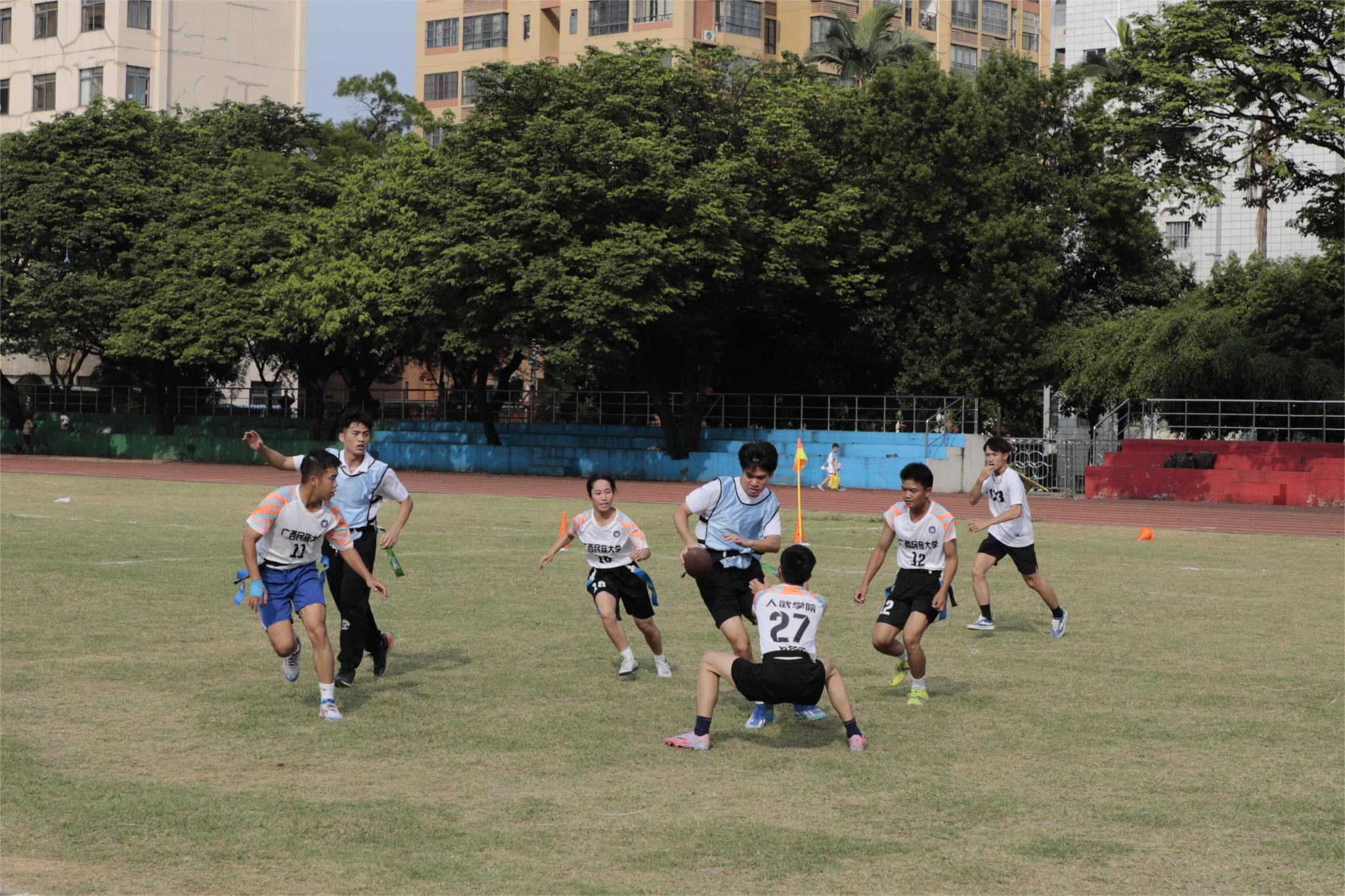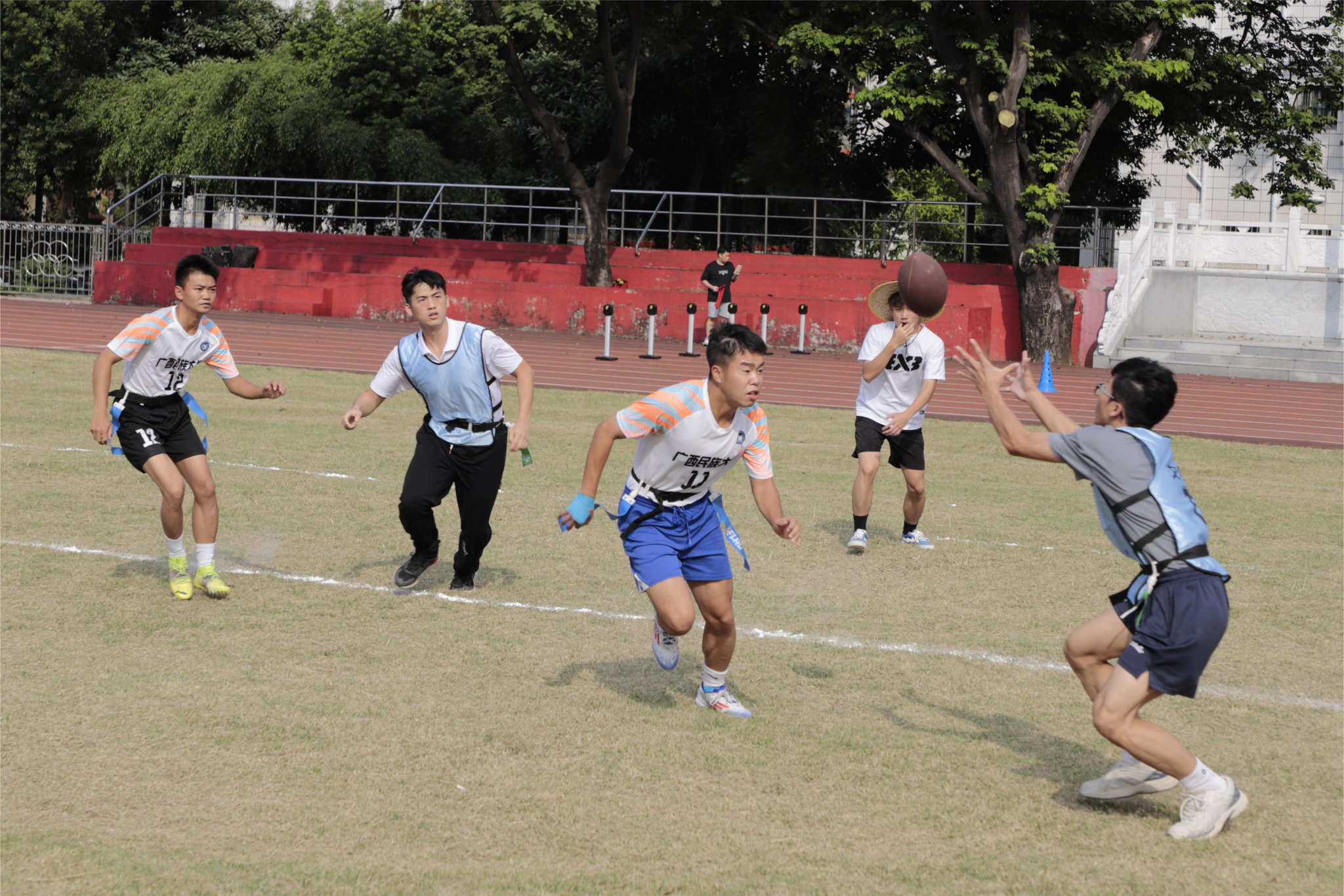 腰旗橄榄球竞赛是2024年体育运动会第一个比赛项目,比赛采用分组循环赛后淘汰赛制,全场男女混合5人制比赛,根据比赛积分取前四名进入淘汰赛。我院代表队在最后一场分组循环赛应战人民武装学院代表队。