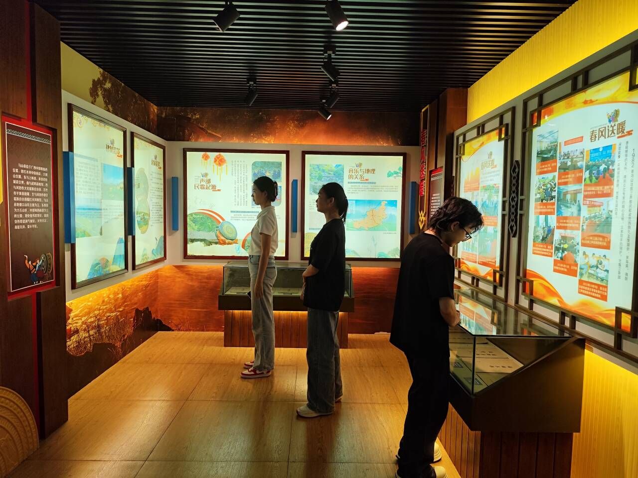 结束访谈后,调研团队在温校长的带领下来到了三声部民歌展示馆。馆内丰富的展品与详实的资料,生动呈现了三声部民歌的发展历程。从排列整齐的曲谱手稿,到不同时期村民演唱的珍贵照片,都在见证着三声部民歌在时代变迁中的传承与创新。此外,团队成员还进一步了解到三声部民歌在当地文化中的重要地位,以及政府和民间力量为保护和传承这一非物质文化遗产所做出的努力,更加深了团队成员们对三声部民歌文化内涵的理解。