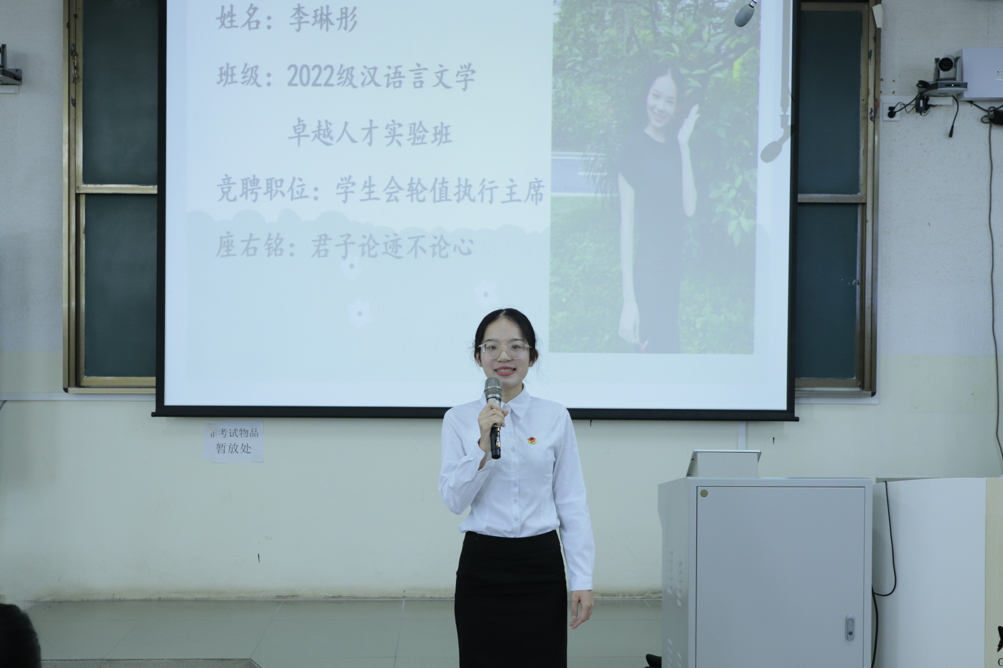 28日下午,常委竞聘会上共有16位选手进行竞聘演说。创新创业部部长李琳彤从自身优势和工作经验两方面进行演说和阐述。她介绍到,在任职期间,她认真对待部门工作,积极组织和参与各项部门活动,积累了丰富的工作经验。她表示,如果能成功当选,自己将进一步提升自身能力,严于律己,脚踏实地完成工作,笃行致远,砥砺奋进。