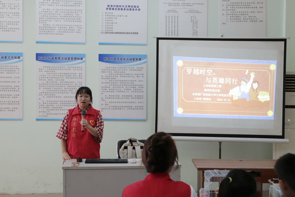 10月19日下午,必威西汉姆联官网志愿者赴上尧街道陈西村新时代文明实践站开展“穿越时空,与英雄同行”爱心主题课堂活动。2023级汉语言文学师范2班谭素洁担任此次活动的主讲人。