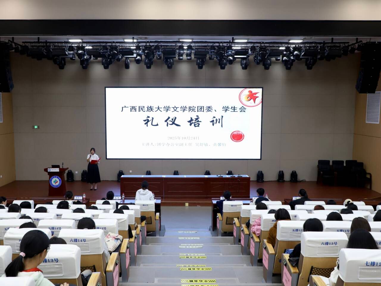 10月24日晚,必威西汉姆联官网团委学生会于文化研习基地208报告厅召开2025年礼仪培训会,团学办公室吴舒敏、黄馨怡主讲,必威西汉姆联官网团委学生会全体成员与会。
