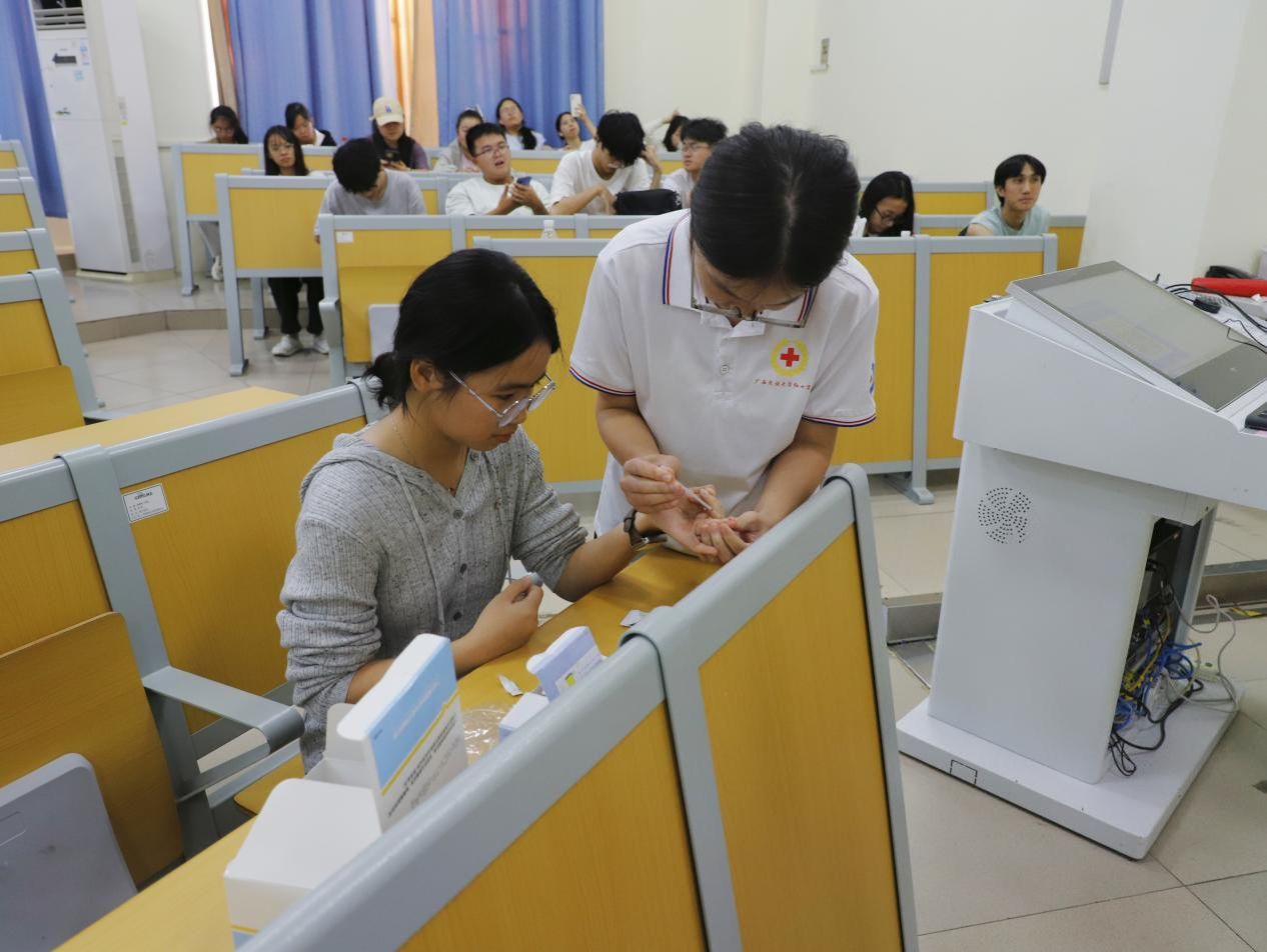 活动现场设置检测试剂实操体验与防艾知识问卷调查环节。在志愿者的积极鼓励和引导下,现场同学主动上台体验艾滋病自我检测的全过程,包括手指消毒、规范采血、样本滴加以及结果判读等步骤。同学们还积极填写问卷调查,与工作人员深入交流艾滋病防护知识。