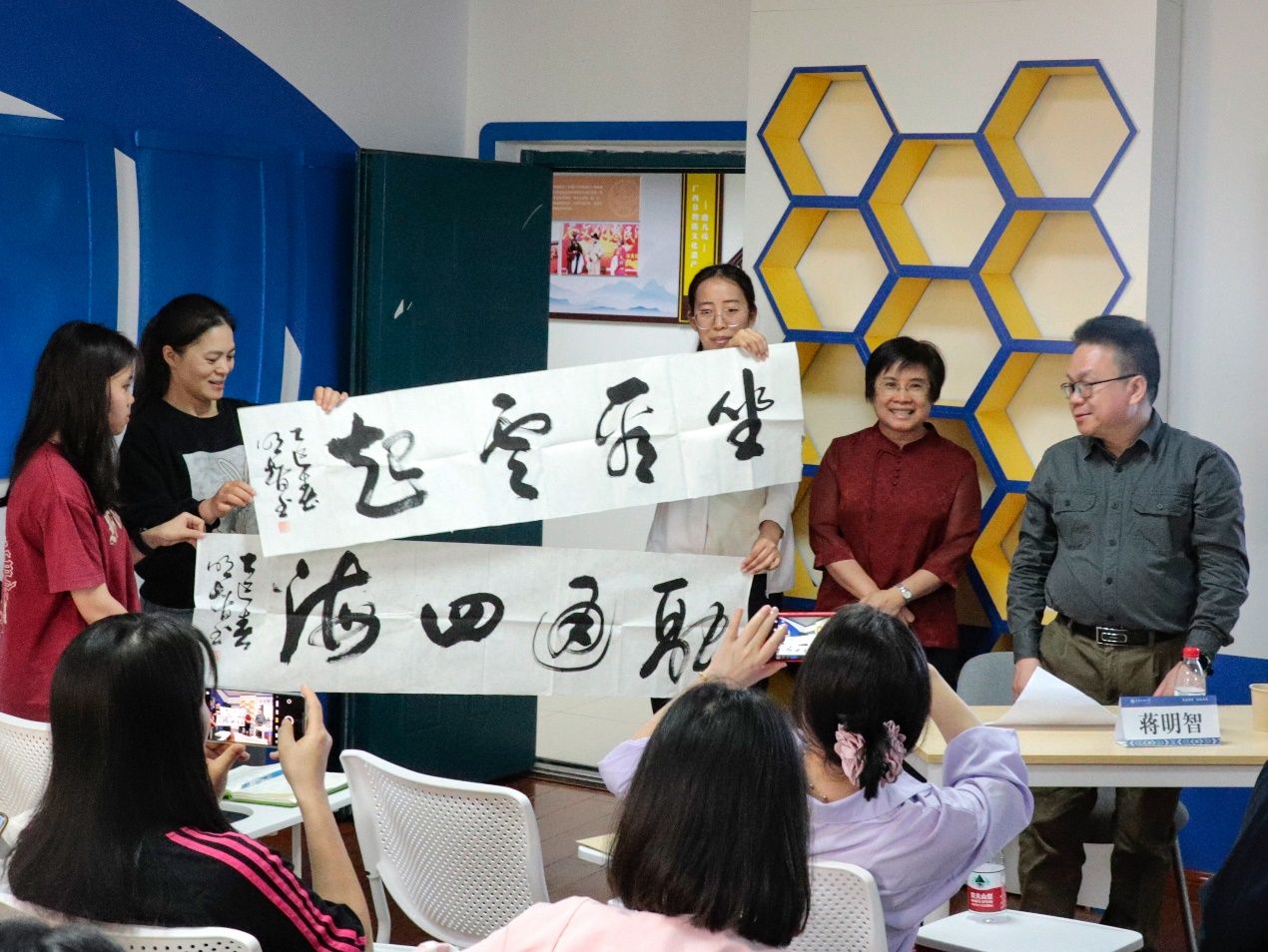 交流环节,蒋明智教授为在场观众进行答疑解惑,指出研究不足,为其点明进一步研究方向。同时,蒋明智教授赠题书法作品“坐看云起”“融通四海”,鼓励在场师生立志笃行,刻苦钻研。