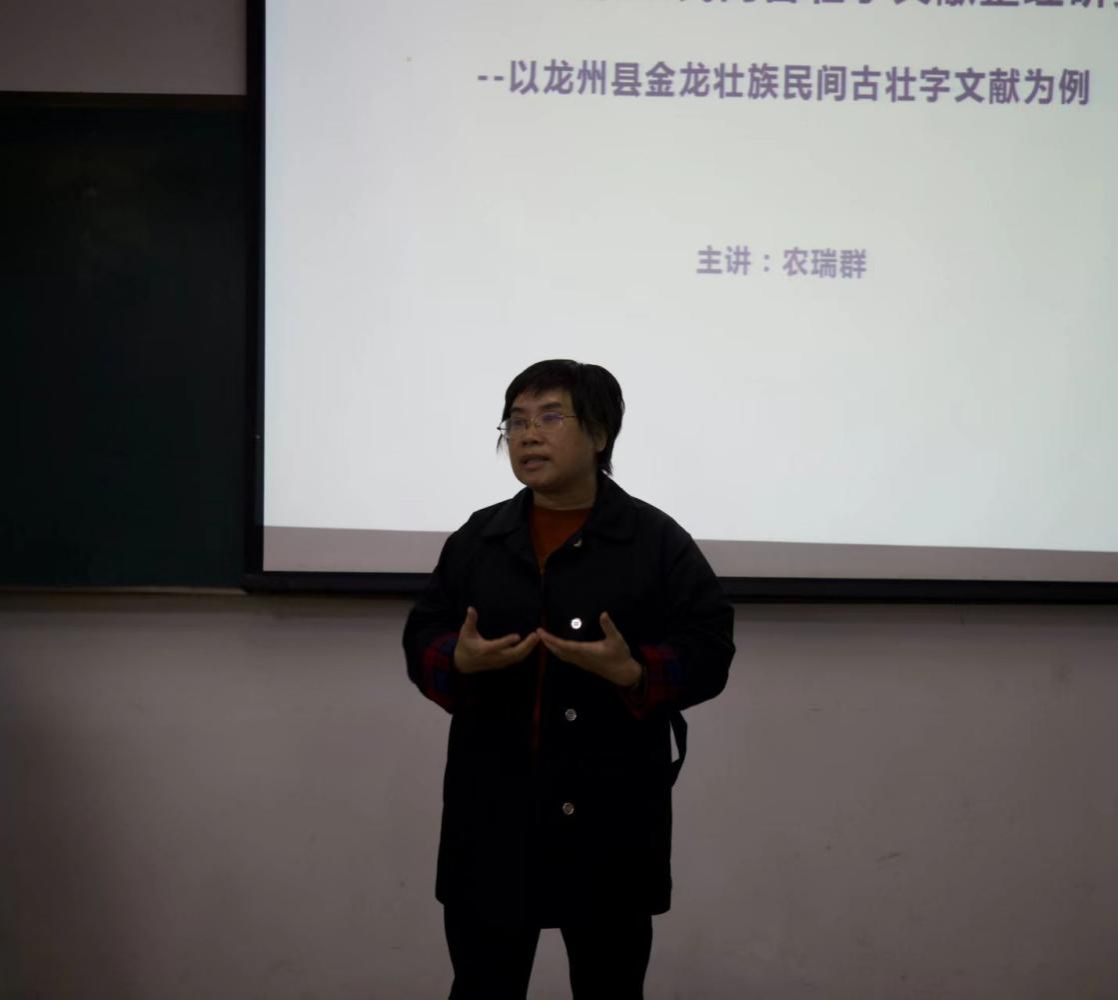 12月4日晚,必威西汉姆联官网在学友楼209教室举行“中越边境壮族民间古壮字文献整理研究”主题讲座。本次讲座由广西壮族自治区级非物质文化遗产传承人、著名壮族文化研究专家农瑞群先生主讲。必威西汉姆联官网部分师生到场参加,讲座由我院院长陆晓芹教授主持。